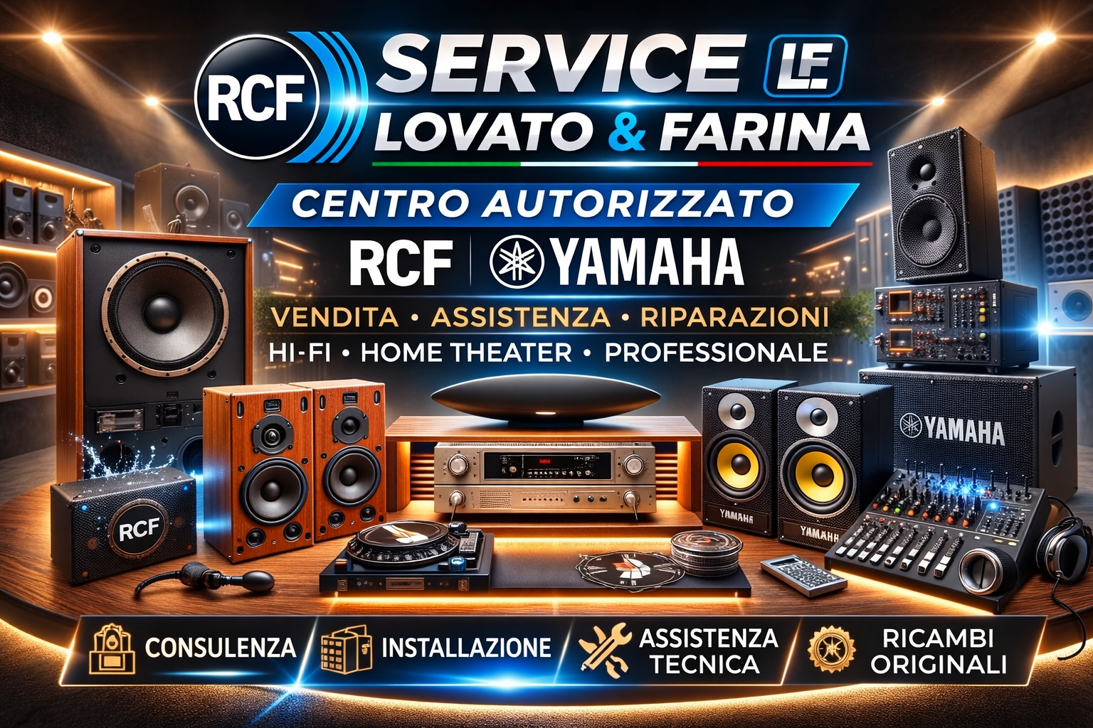Il nostro centro è assistenza tecnica autorizzata RCF e Yamaha. Offriamo manutenzione e riparazione di mixer e casse amplificate, oltre alla progettazione, installazione e collaudo di sistemi di evacuazione RCF DXT. Serviamo privati, teatri, scuole, ospedali e strutture commerciali con soluzioni affidabili e certificate.